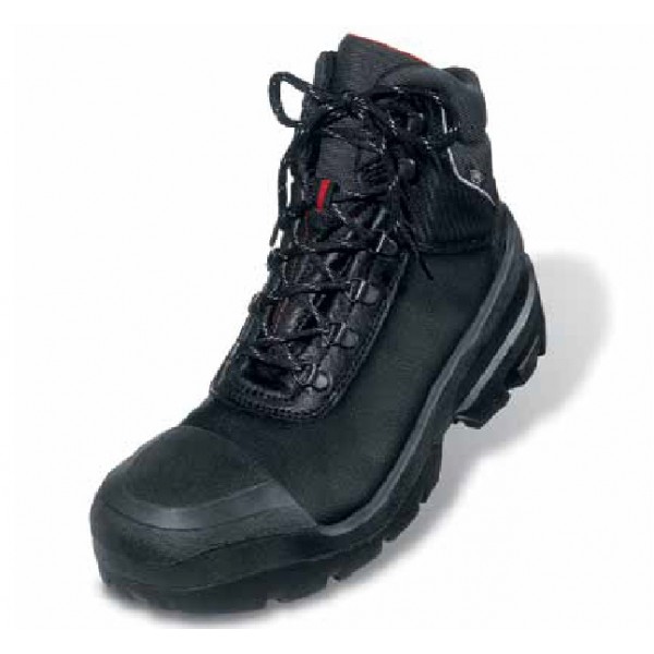 Robosztus, modern, végig fűzős, magasszárú bakancs nagy igénybevételre. Vízálló bőr felsőrész orrborítással, szellőző textil bélés, széles lábfej és orr-rész, hurkos, könnyen állítható fűzőrendszer, kényelmes, párnázott cipőszár és nyelv jellemzi. A sarokterhelést optimálisan csillapító, energiaelnyelő Uvex Hydroflex® 3D GEL került kialakításra a sarokcsont alatt, kiegészítő energiaelnyelő zónával a láb elülső részénél. Az Uvex Quatro S3 antibakteriális, bőrsemleges, kivehető antisztatikus talpbetéte kiváló lábklímát biztosít nedvesség-ellenőrző rendszerével. Az Uvex anti-twist integrált saroktámasz miatt, nagyobb stabilitással és csavarodás elleni védelemmel bír. Az Uvex Quatro S3 mélyen barázdált, kiváló csúszásbiztosságú, körkörösen védő, megerősített, jól tapadó, mászást segítő középrésszel. Hosszan tartó viseletre anatómiailag kialakított belső, lekerekített élek, rendkívül puha bélés, acél lábujjvédő és átszúrás elleni talplemez jellemzi.