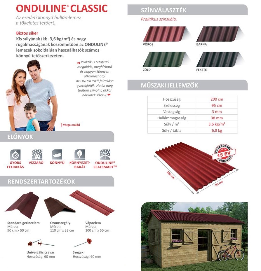 Érdemes Onduline Base bitumenes hullámlemezt választani, mert könnyen kezelhető, vágható (vágókéssel, kézi vagy elektromos fűrész segítségével), formázható és rögzíthető, így teret enged a tervezői fantáziának. Több színben kapható (fekete, vörös, barna, zöld), ráadásul kiváló színmegtartó tulajdonsággal bír. Súlya könnyű, mégis hő - és hangszigetelése a maga nemében egyedülálló.