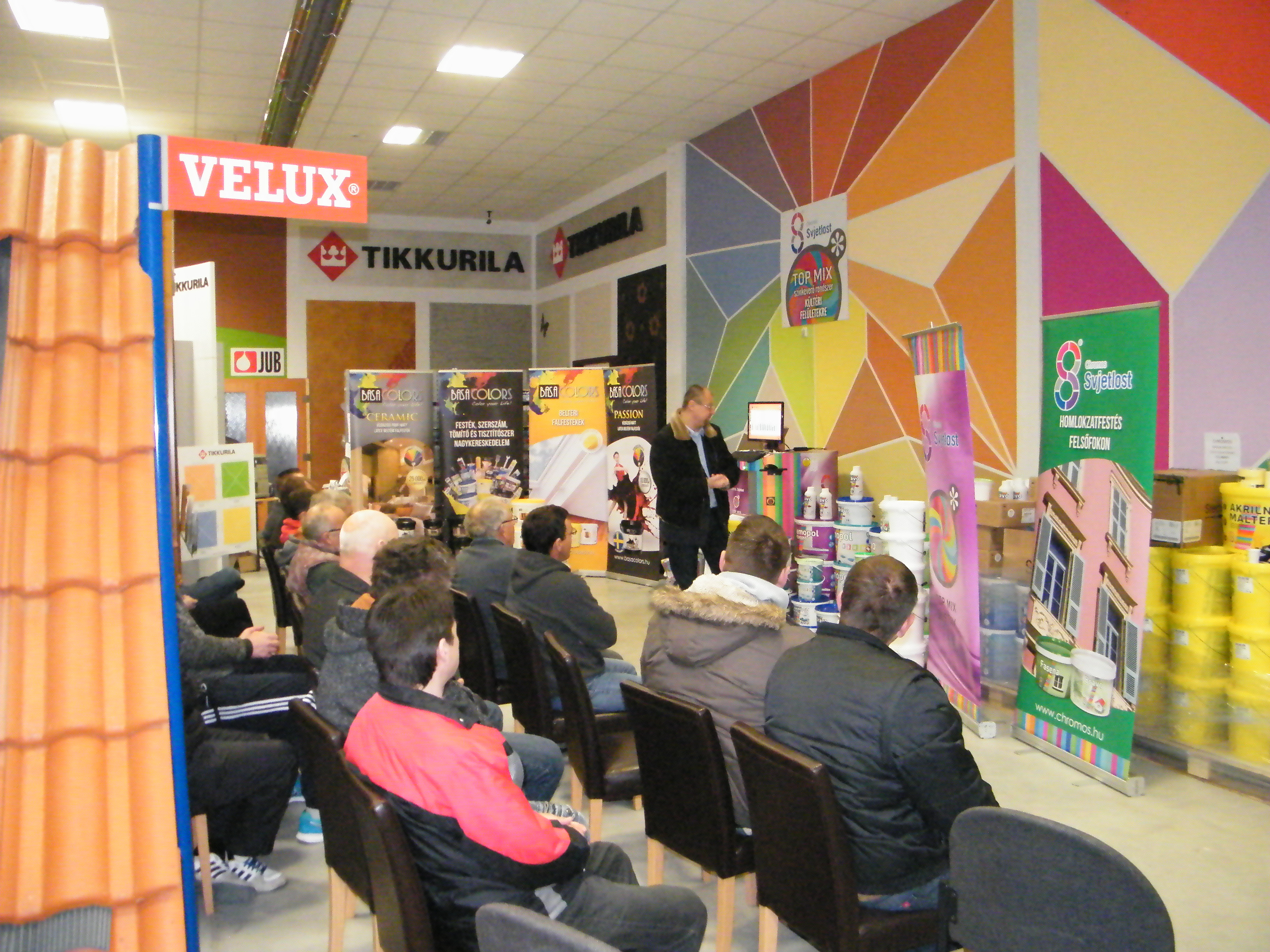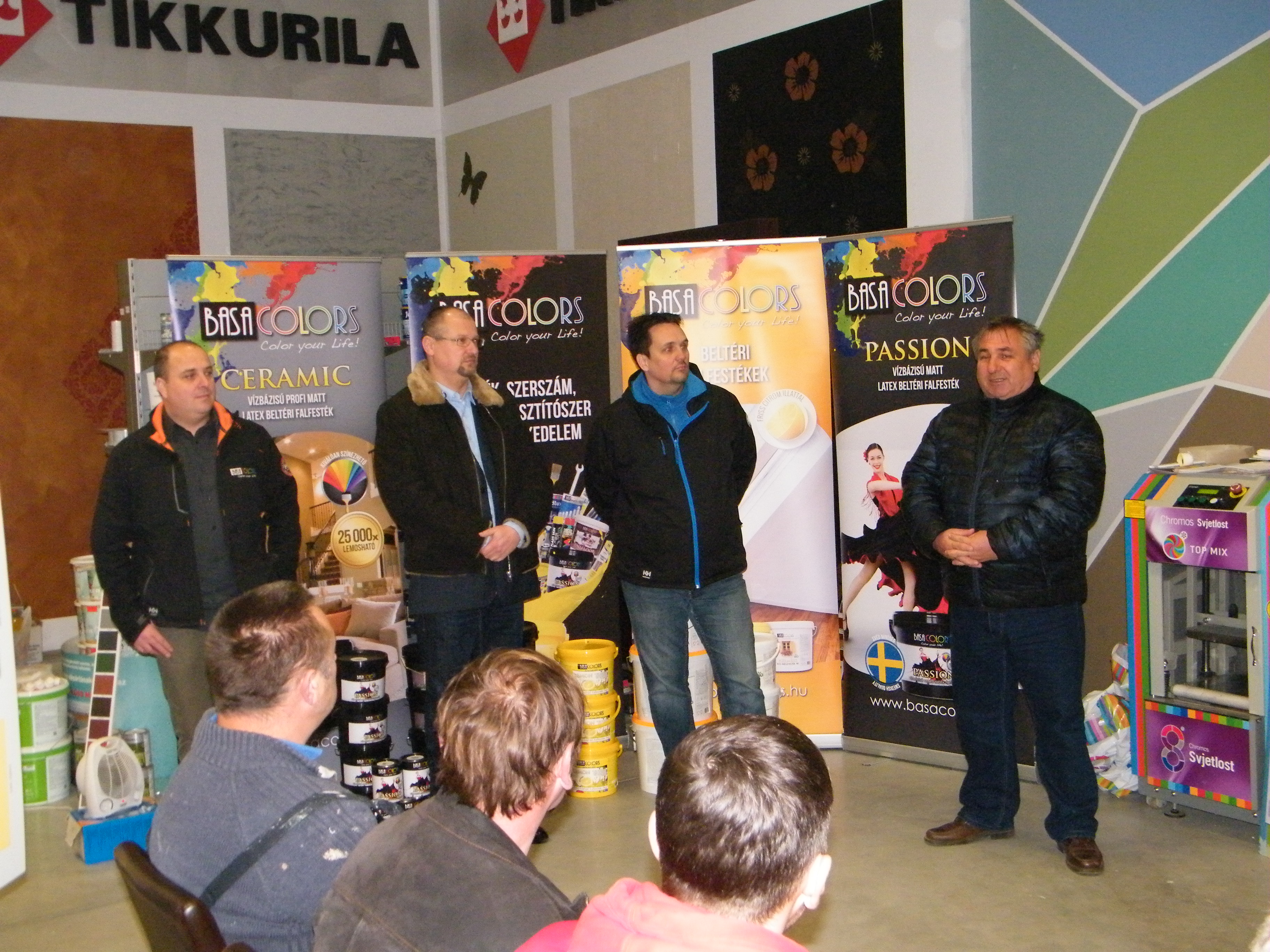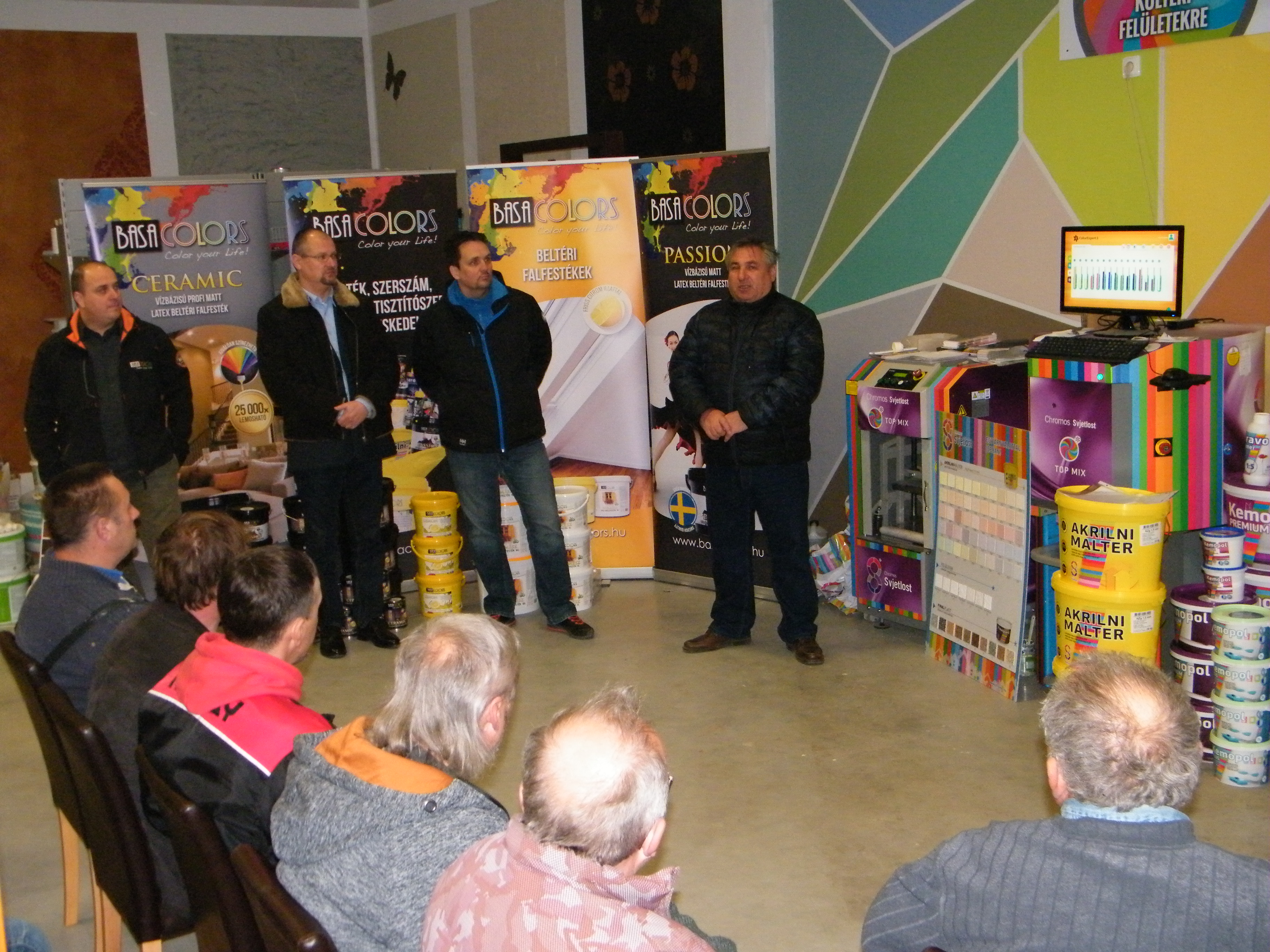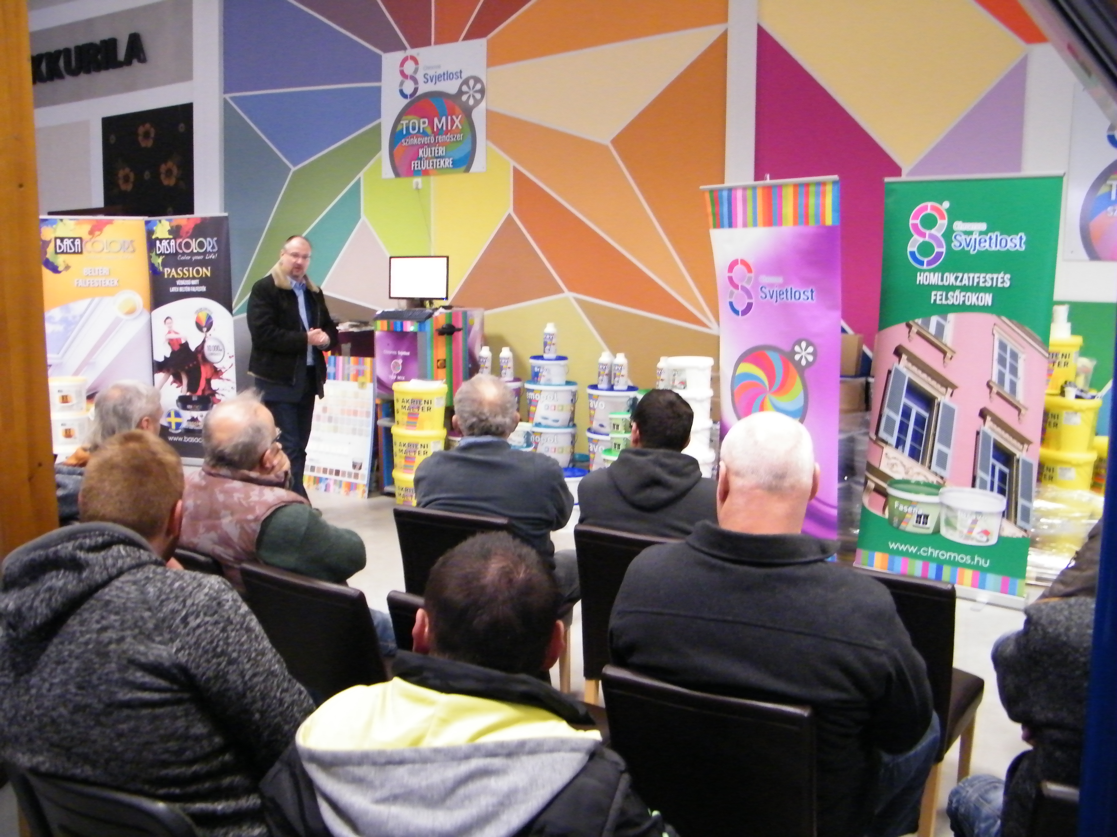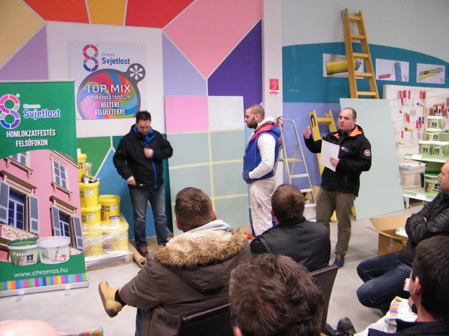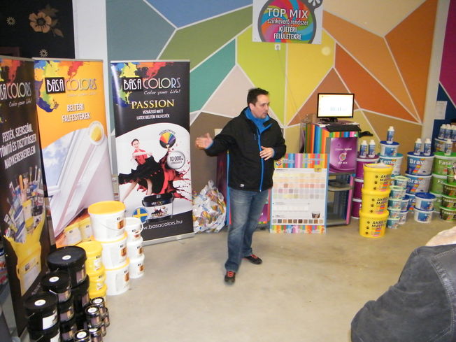 A találkozó nagyon jó hangulatban telt, mely köszönhető elsősorban Havér Tamásnak a Chromos képviselet vezetőjének, aki lendületes, és rendkívül érdekes szakmai bemutatót tartott, melybe bevonta a jelen lévőket is, ezáltal magával ragadva őket a Basacolors és a Chromos világába.